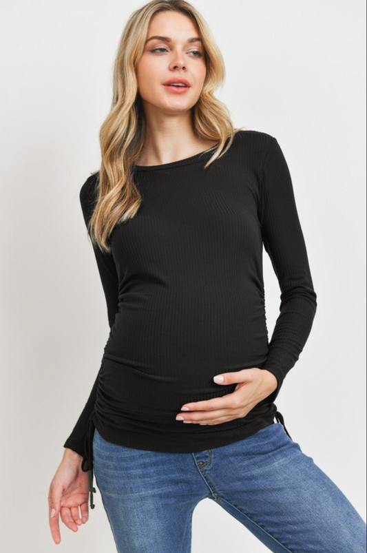 Burgundy Ribbed Drawstring Long Sleeve Maternity Top
