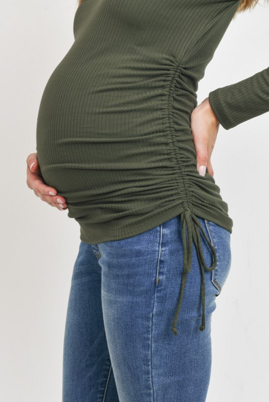 Olive Ribbed Drawstring Long Sleeve Maternity Top