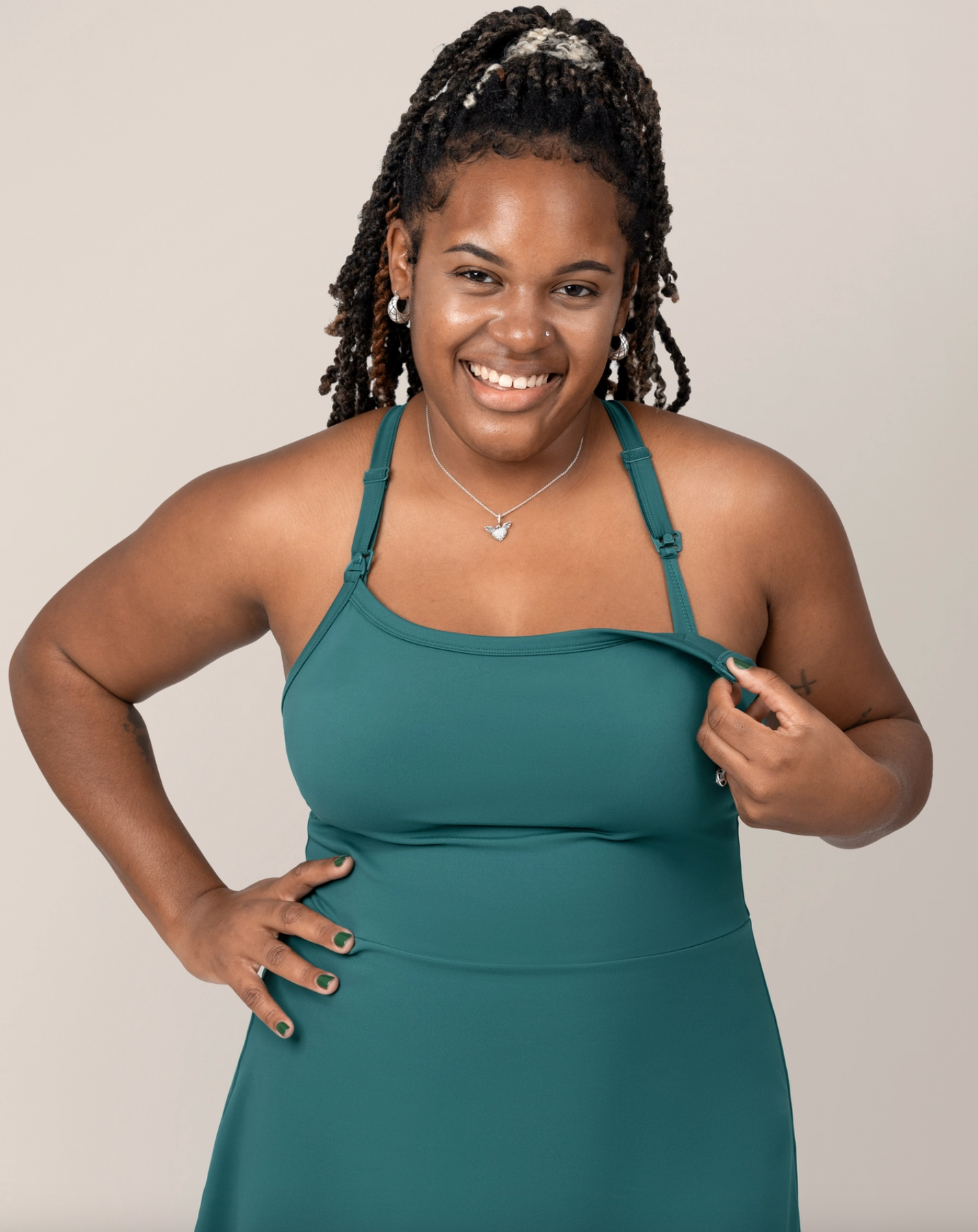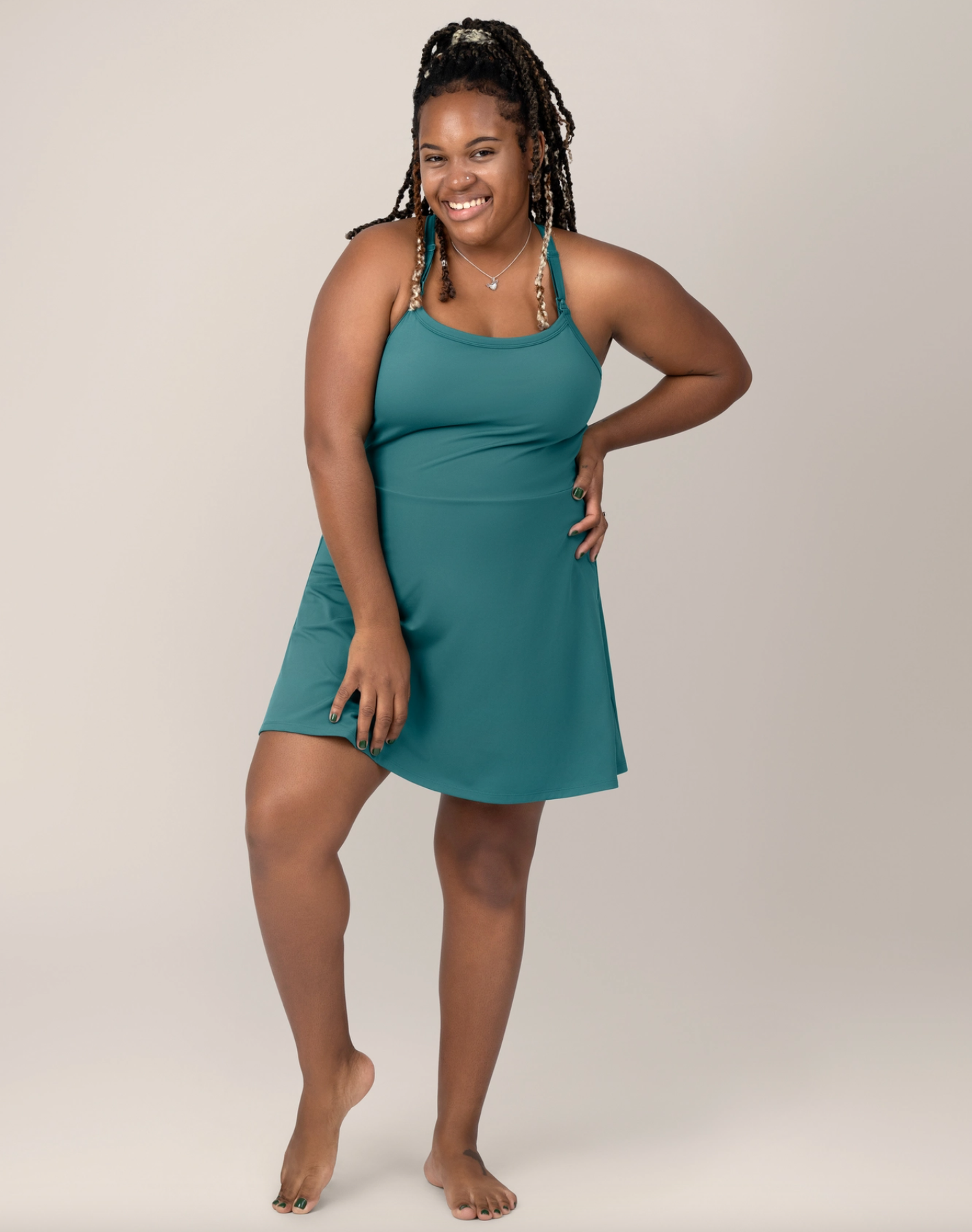 An activewear nursing dress that does it all. Great for everything from playing with the kids to playing pickleball, the Stevie Active Racerback Nursing Dress combines cooling comfort from our exclusive Momentum fabric with an easy-to-wear tennis dress design, making it a must-have for postpartum moms. The flattering A-line silhouette is fitted through the bust and waist before flaring into a relaxed skirt, and the racerback design offers a sleek, sporty touch. Adjustable straps and a built-in shelf bra with fixed padding provide light support while easy nursing clips make feeding quick and convenient.